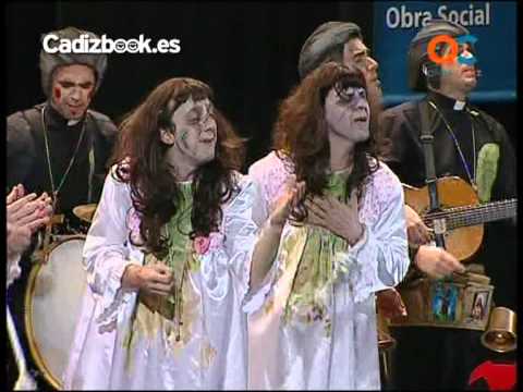 Sacerdotes y niñas del exorcista aparecieron por el escenario para cantar el repertorio en cuarta posición de la primera parte. La chirigota cantó la presentación e hicieron tipo por todo el escenario. Tanto los curas como las jóvenes poseídas por el diablo recibieron los aplausos del teatro. Los dos pasodobles fueron interpretados seguidamente. La letra, bien construida y defendida por el grupo, criticaba al Papa por visitar los países desarrollados y no hacerlo a los del tercer mundo como Somalia. El segundo hablaba de la boda de una pareja que contrajo matrimonio teniendo como testigo a Jesús Nazareno y que la mujer no podía quedar embarazada. Muchos aplausos para ambas letras. El primer cuplé repasó las bodas de los famosos y terminó con la de la duquesa de Alba. El segundo recordaba a la comparsa ‘Los miserables’ y a la letra que criticaba al Papa, cuyo autor fue Antonio Martínez Ares, al que el Papa actual se encontró en Madrid cuando participó en la Jornada de la Juventud y le dio sus quejas. Aplausos para ambos. El popurrí terminó la actuación que fue muy aplaudida. Correctos los chirigoteros.