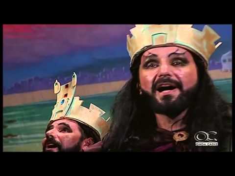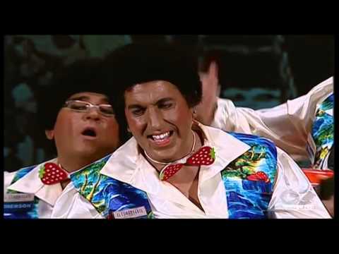 Desde la localidad sevillana de Dos Hermanas se presenta en el concurso de agrupaciones del Teatro Falla, la comparsa Los guapos. Pícaros, reyes del amor que vienen a echar toda clase de piropos. El primero de los pasodobles sobre el problema del alcoholismo que destroza la vida de muchas personas que se ven abocadas a suicidio. El segundo trata de las distintas facetas que tiene el miedo en los humanos que terminan con un piropo a Cádiz diciendo que no todos en Sevilla barren pa casita, en recuerdo de la polémica agrupación sevillana del pasado concurso. Recibe los aplausos del público. El primer cuplé sobre Dani Güiza que ha cambiado los caballos por las caballas caleteras. El segundo sobre una niña que conoce que es poco agraciada. Estribillo, muero de amor y por tus huesos, pero mañana será otro día. Aplausos del público. Terminan su actuación con un popurrí donde cuentan sus correrías como el guapo del barrio que son. Fiero y seductor, pero para ellas son un bombón. Seductores que utilizan todas las armas de las que disponen para enamorar a una mujer. Despedida con aplausos.
