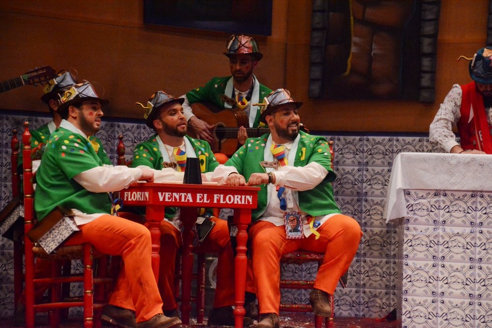 Turno en la fase cuartos de final del concurso de agrupaciones del Falla para la chirigota de Chiclana de la Frontera, Pa religión la mía. El pasado año consiguieron el tercer premio en su modalidad con Los sereníssimos. Representan a una peña carnavalesca como un templo sagrado donde van los fieles a recuperar todo lo que se ha perdido. Vienen a bautizar al teatro con el compás chirigotero del tres por cuatro. Presentación que arranca los primeros aplausos del público. El primero de los pasodobles a un hombre que lleva en la cartera la foto de una niña a la que no puede ver porque no es su padre, a pesar de que la conociera desde chica por compartir vida con su madre. El segundo una crítica al gobierno donde se acuerdan de él cada vez que ven su nevera vacía, pero dicen que sus letras en carnaval son para hacer reír y lanzar piropos, porque problemas ya tenemos todos. Ronda de cuplés que comienzan diciendo que murieron y fueron al infierno. Pero antes La eternidad fue a por ellos y cuando vieron la cara del “piojo” se volvieron para el infierno. El segundo a la polémica del cencerro donde les penalizó el jurado y al final aceptó su recurso. Dejan el cencerro en el suelo para que se lo ponga en el cuello los que se alegraron de los que les pasó. Estribillo donde se ha puesto de moda cantar bonito y tocar muy bien, sin embargo…”con trabajo hay menos”. Terminan su actuación de cuartos con la interpretación del popurrí. Oración en el nombre del Peña, Fletilla y Cañamaque. “La gente no respeta ni que estamos en carnaval”. Cuartetas que provocan las risas del público que corean con ellos algunas de las estrofas. Incluyen nuevas letras en el popurrí como una donde la lían todos tocando el polémico cencerro. Agrupación que pone de nuevo al público del teatro en pie que los despide con fuertes aplausos y gritos de campeones.