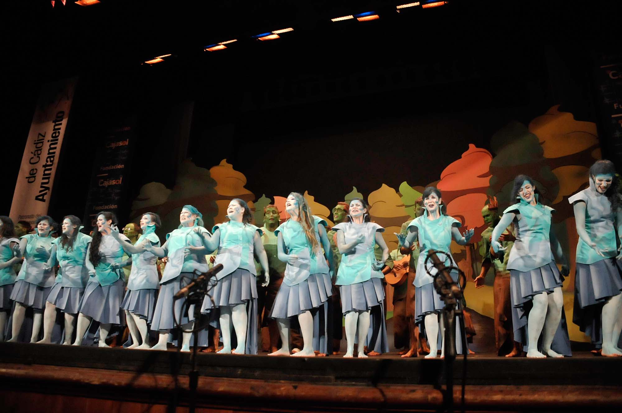 El coro de Sanlúcar ‘Sanlúcar’ se presentó por primera vez en su historia en el Concurso de Agrupaciones del Gran Teatro Falla. Representando a lo más genuino de su tierra, el río Guadalquivir, que desemboca en esta localidad gaditana, cantan una presentación a ritmo de alegrías donde las voces de las mujeres de este coro mixto cobran protagonismo. Suena muy bien este grupo que se enfrenta por primera vez al Jurado. El primer tango de presentación, o de medida. Dedicado al tango, que como dicen ellos nace en Cádiz, está hecho con la mar. Y ellos traen un poco de esa mar desde Sanlúcar con su río hasta la capital. En el segundo tango aprovechan su tipo de río Guadalquivir para hablar del narcotráfico. Precisamente esta localidad está siendo muy castigada por la droga en los últimos años por los narcotraficantes que usan la ribera para introducirla. El estilo de Quico Zamora queda patente en la música del 2x4. Los cuplés, el primero sobre el coro. Dicen que su actuación ha creado mucha espectación, por eso fue la sesión en la que primero se agotaron las entradas. Y dicen que si quiere el público, que se queden después a escuchar ‘La comparsa rosa’ y a Juan Carlos Aragón. El segundo cuplé va acompañado de imágenes que se ven en una pantalla dispueta sobre sobre escenario. Hablan de Sálvame y lo relacionan con el Carnaval y con las chicas del coro. Ellas desaparecen de escena y se las ve en una pantalla con el Zoleta y dándole besos al presidente del Jurado, Antonio Fernández Repeto. Por eso dicen que su pase a Cuartos de Final está asegurado. Estribillo corto y muy pegadizo. El popurrí, quizás un poco más bajo de calidad que el resto del repertorio, pero entonado y coordinado a la perfección las mujeres y los hombres. Juegan con el río Guadalquivir para recorrer Andalucía. Ritmos de nuestra comunidad en cada una de las cuartetas, y ovación para la cuarteta final y agradecimiento de este grupo que se estrena.