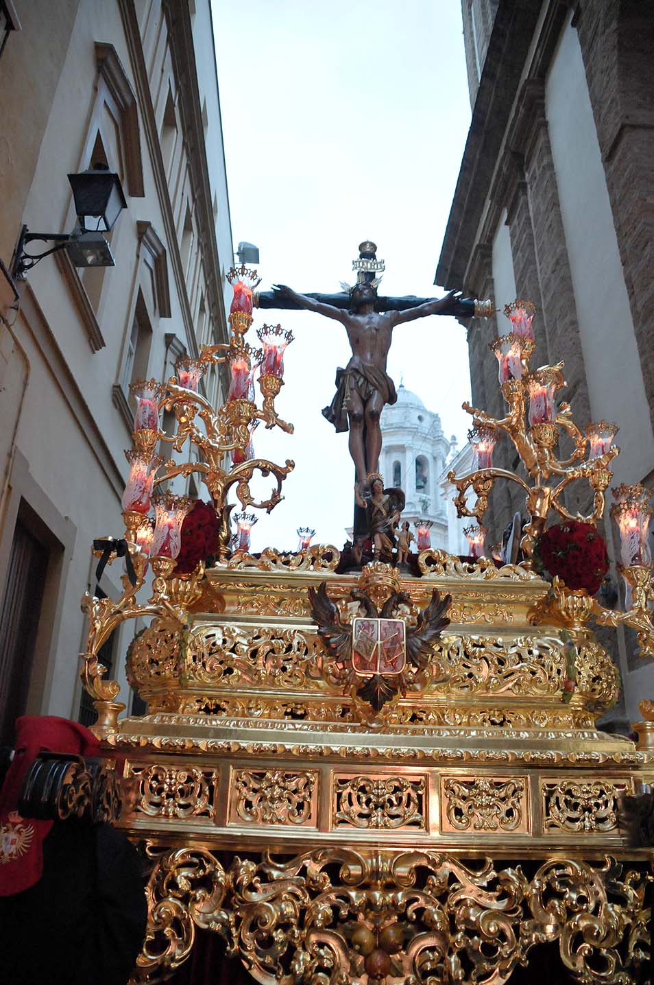 Tras anunciar su entrada la agrupación musical Polillas con la entrada de la banda sonora de la película Ben Hur, la Cruz de guía salió puntual, a las 17.15 horas, de la iglesia del Santo Ángel, el resto e tramos de penitentes han ido incorporándose al cortejo desde el patio de la facultad de Medicina. Curiosamente, este patio perteneción hace unas décadas a la parroquia aunque fueron de los terrenos que se cedieron a la Universidad de Cádiz.